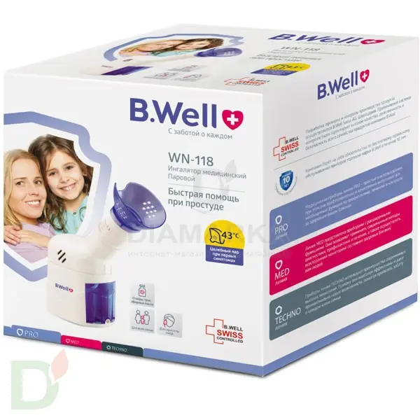 <h2>Что такое ингалятор и зачем он нужен?</h2> Ингаляция - один из вспомогательных методов лечения заболеваний верхних и нижних дыхательных путей, а также аллергии. Принцип работы компрессорных ингаляторов основан на распылении мелкодисперсного аэрозоля (частицы лекарства размером 1-5 микрон), который с легкостью проникает в дыхательные пути и уже там оказывает нужный терапевтический эффект. Кроме того, использование ингалятора позволяет уменьшить расход лекарства.<br> <br> <h3>Характеристики ингалятора WN-118</h3> <ul> <li>Для лечения верхних дыхательных путей. Прибор образует облако пара с размером частиц более 10 микрон, которые воздействуют на верхние дыхательные пути</li> <li> Эффективная помощь при насморке, фарингите, ларингите</li> <li> Отвары трав, эфирные масла. Паровой ингалятор B.Well создает пар с размером частиц более 10 мкм для лечения верхних дыхательных путей и ухода с отварами трав, эфирными маслами, минеральной и морской водой</li> <li> Мягкий пар 43°С. Ингалятор B.Well поддерживает комфортную температуру пара 43°С. Пар такой температуры не обжигает, благотворно влияет на кожу и эффективен при лечении.</li> <li> SPA для лица. В комплекте парового ингалятора B.Well входит маска для косметических процедур с лечебным паром</li> <li> Два температурных режима. Комфортно для детей и взрослых</li> <li> Высокая степень безопасности. Для процедуры требуется совсем немного воды, которая надежно закрыта в специальном резервуаре – нет риска пролить кипяток</li> <li> Автоматическое отключение</li> <li> Питание от сети</li> </ul> <h3>Комплектация</h3> <ul> <li>Ингалятор медицинский (паровой)</li> <li> Маска (для ингаляций)</li> <li> Маска (для косметических процедур)</li> <li> Емкость для лекарства</li> <li> Руководство по эксплуатации и гарантийный талон</li> </ul>