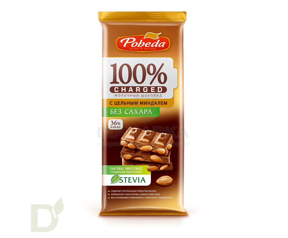 Шоколад Победа Чаржед Молочный с миндалем без сахара, 90г.